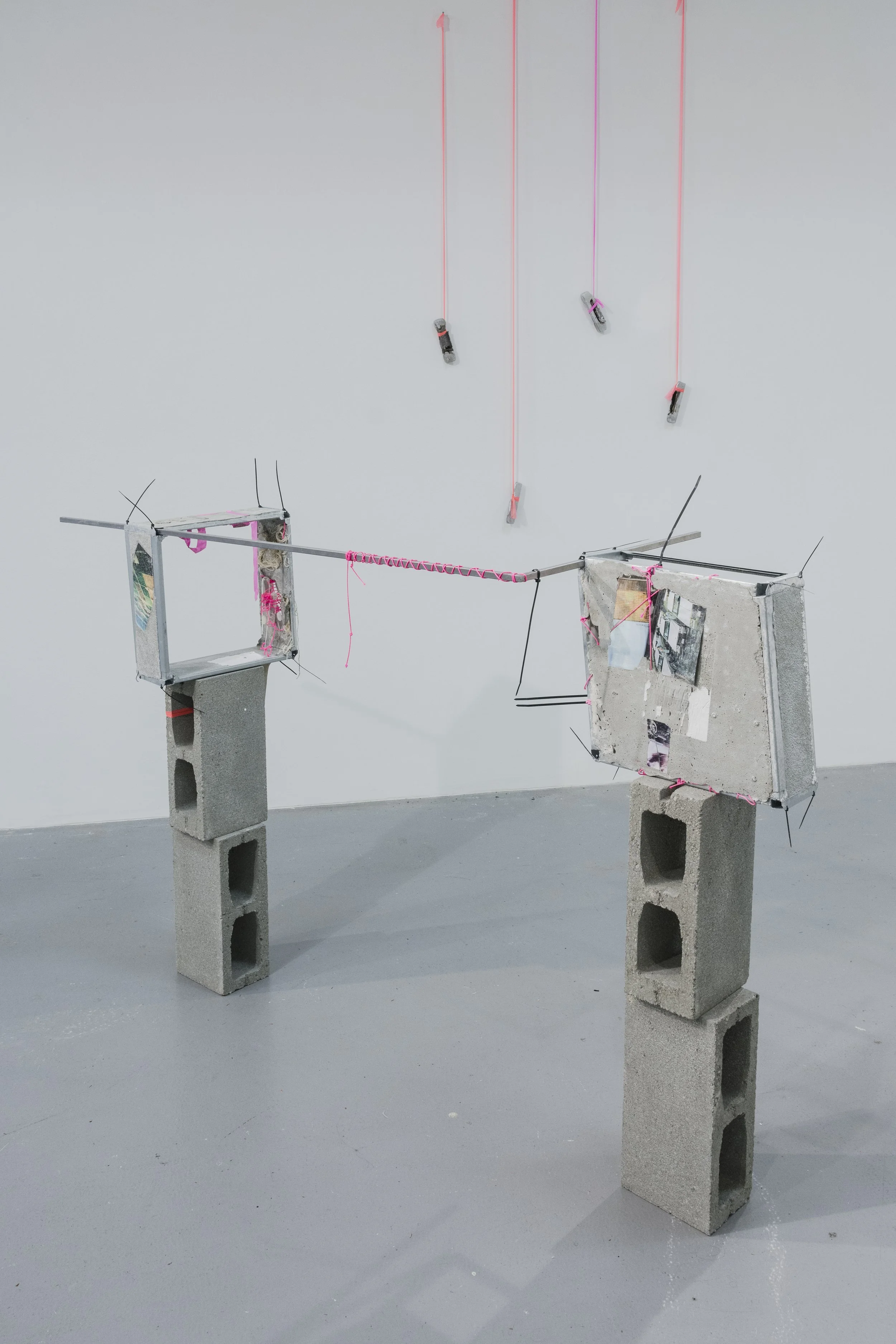 1981 National Geographic magazine clippings, neon flagging tape, nylon thread, zip ties, aluminum vent covers, receipt paper, glass test tubes, wool yarn, hand-woven textile, annotated pages from Vivek Chibber’s ABCS of Capitalism: Capitalism and The State, Styrofoam residue, concrete, steel, and cinder blocks.