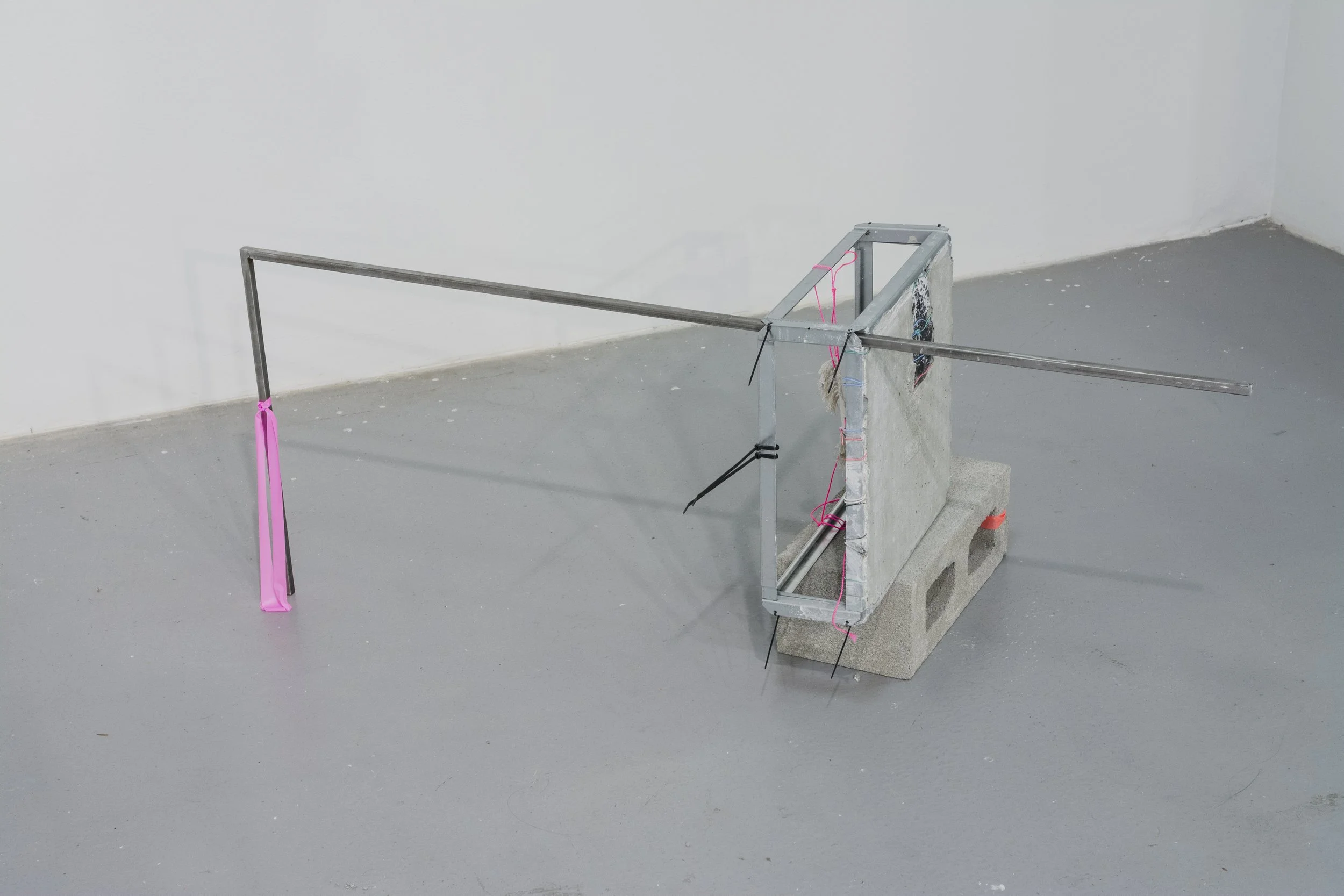Drop cloth scrap with weft threads removed, nylon thread, neon flagging tape aluminum grommets, insulated copper wiring, found photograph of a tree, Styrofoam residue, concrete, steel, and cinder blocks.